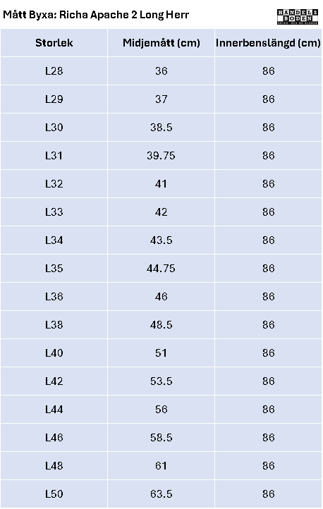 Richas Apache 2 mc-jeans är tillverkade med en blandning av stretchigt bomull och DuPont™ Kevlar®. Detta säkerställer att jeansen är bekväma men samtidigt slitstarka. De är fullt utrustade, med säkerhetssömmar och förstärkningar på utsatta områden. Det finns också justerbara skydd för knäna, så att dem passar just dig. Byxornas underdelar är elastiska för att skapa en tight passform.