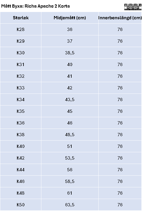 Richas Apache 2 mc-jeans är tillverkade med en blandning av stretchigt bomull och DuPont™ Kevlar®. Detta säkerställer att jeansen är bekväma men samtidigt slitstarka. De är fullt utrustade, med säkerhetssömmar och förstärkningar på utsatta områden. Det finns också justerbara skydd för knäna, så att dem passar just dig. Byxornas underdelar är elastiska för att skapa en tight passform.